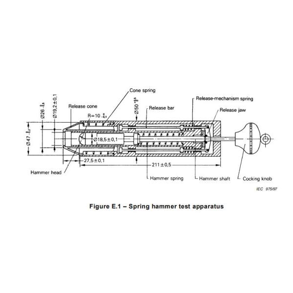 Adjustable universal spring hammer is designed according to IEC62262 and IEC60068-2-75, and meet the requirement of IEC60068-2-63, IEC60598 and etc.. The universal spring hammer includes 6 IK levels: 0.14J (IK01), 0.2J (IK02), 0.35J (IK03), 0.5J (IK04), 0.7J (IK05), 1J (IK06). IK ratings are defined as IKXX, XX is a number from 00 to 10 which indicates the degrees of protection provided by enclosures against external mechanical impacts. it is suitable for outer casing, operating rod, handle, knob, indicator light, signal lamp and lampshade of household and similar electronic and electrical products and their accessories and similar equipment, to assess the safety performance and strength level of the product.